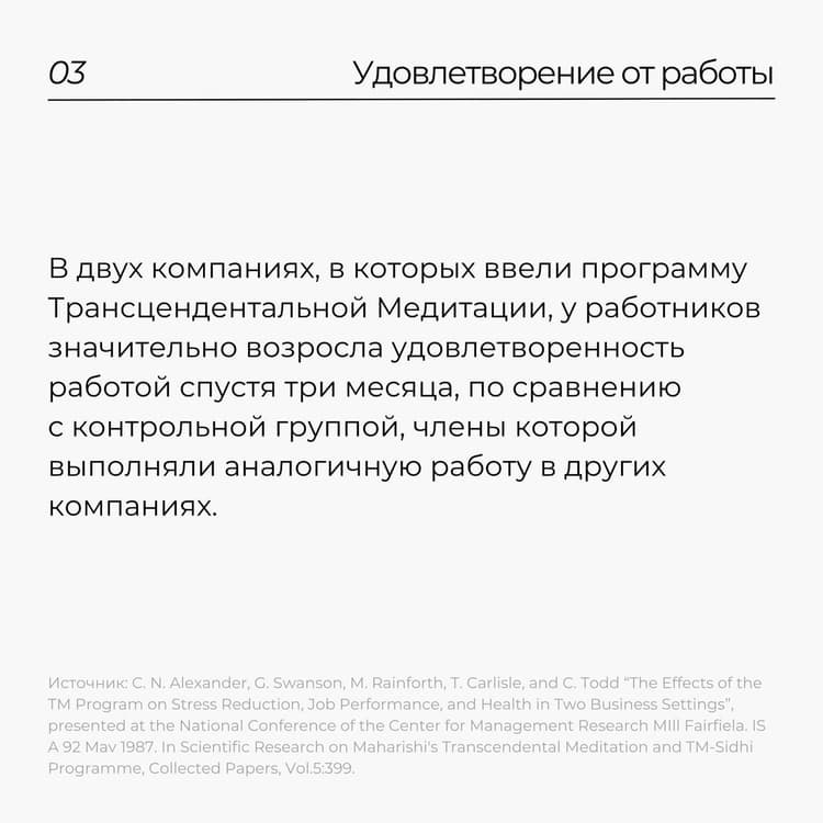 Научные исследования о влиянии практики Трансцендентальной Медитации на профессиональную деятельность показывают положительные результаты: 1️⃣в улучшении отношений в коллективе; 2️⃣в росте качества выполняемой работы; 3️⃣в степени удовлетворенности результатами труда.