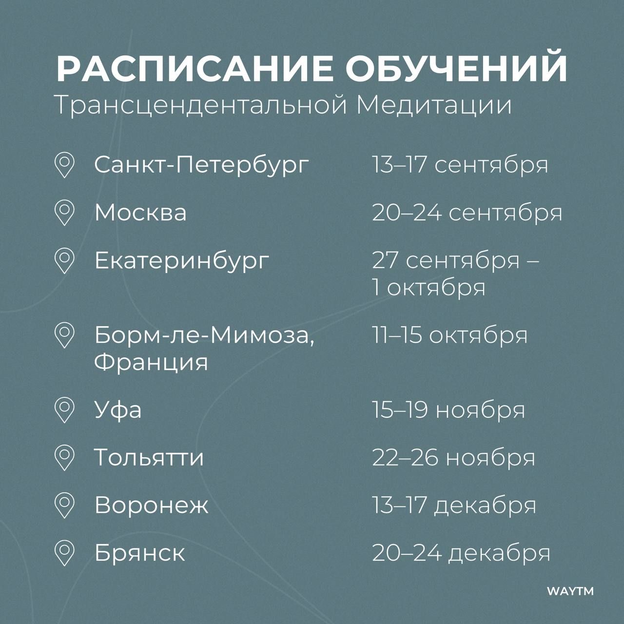 Расписание обучений Трансцендентальной Медитации на второе полугодие 2024 года