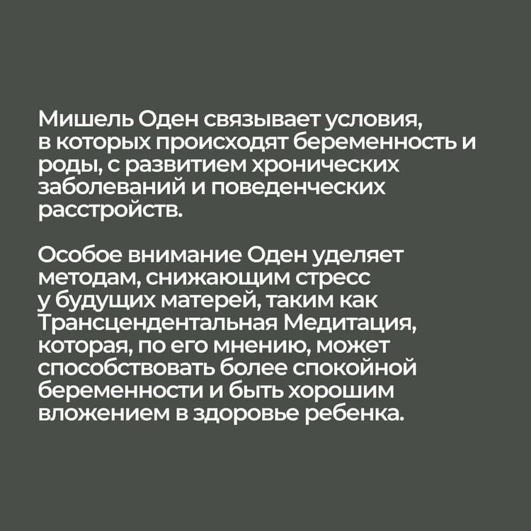 Мишель Оден, известный французский акушер-гинеколог, в своих книгах и выступлениях неоднократно подчеркивал важность не только физического, но и психологического состояния женщины во время беременности и родов. Медитация и другие методы расслабления рассматриваются им как важные инструменты для создания благоприятной атмосферы, которая может способствовать более естественному и мягкому процессу родов.