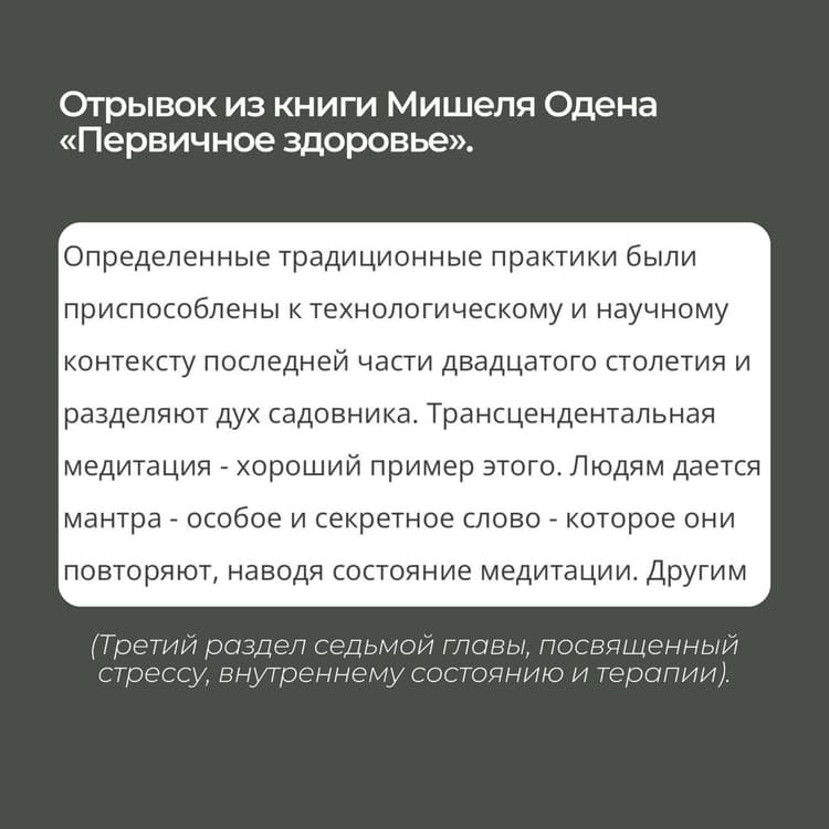 В своей книге «Первичное здоровье» Мишель Оден упоминает Трансцендентальную Медитацию как эффективное средство для снижения стресса у будущей матери и хорошим вложением в здоровье ребёнка ↑