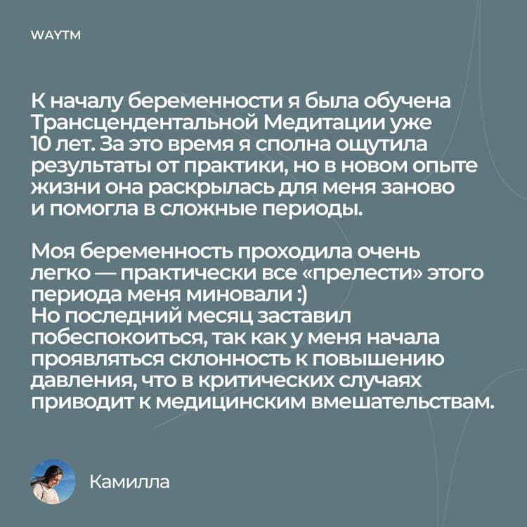 Камилла рассказала о своем опыте практики Трансцендентальной Медитации в одном из самых важных периодов своей жизни — беременности: • как по-новому раскрылась практика спустя 10 лет после обучения; • как ТМ помогла справиться с тревожностью и страхами; • как практика подарила внутренний покой и уверенность в себе и своих действиях.