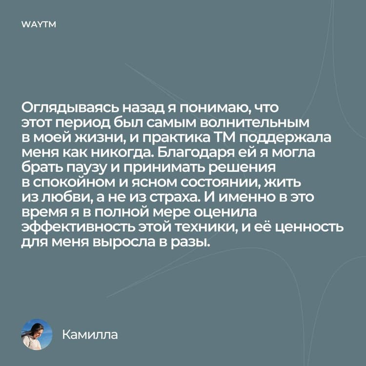 «Благодаря ТМ я чувствую огромный прилив сил и энергии. Как только я начала практику, появилась уверенность в своей деятельности. Я чувствую в какую сторону мне двигаться и знаю, что принимаю только правильные решения.