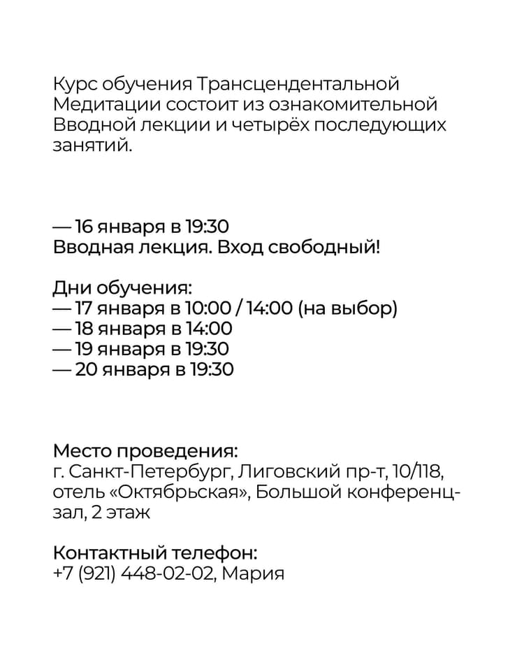 ℹ Напоминаем, что уже в эту пятницу вы сможете посетить бесплатную Вводную лекцию в Санкт-Петербурге и со следующего дня пройти полный курс обучения Трансцендентальной Медитации.