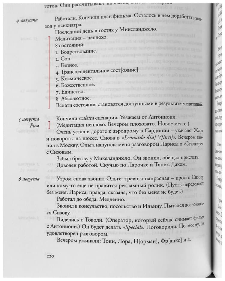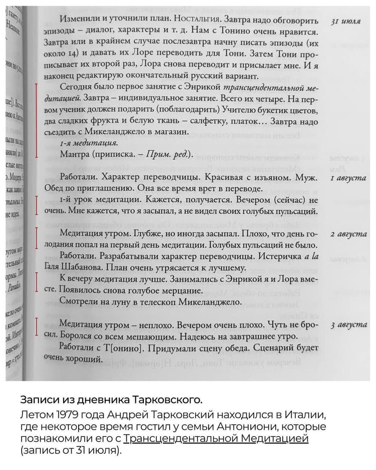 В своих дневниках под названием “Мартиролог” Андрей Тарковский, советский режиссёр, сценарист; народный артист РСФСР, лауреат Ленинской премии, делится своими наблюдениями во время обучения Трансцендентальной Медитации и первых самостоятельных практик.“Страницы дневников – уникальное свидетельство жизни Андрея Тарковского, написанное его собственной рукой, – исповедь художника в поисках Пути и творческой Свободы; трогательное восхваление жизни, полное надежды и веры, даже перед лицом смерти, поскольку всё его творчество, его идеал, его жертва – не что иное, как крайний жест надежды на Человека” – комментарии редакции книги.