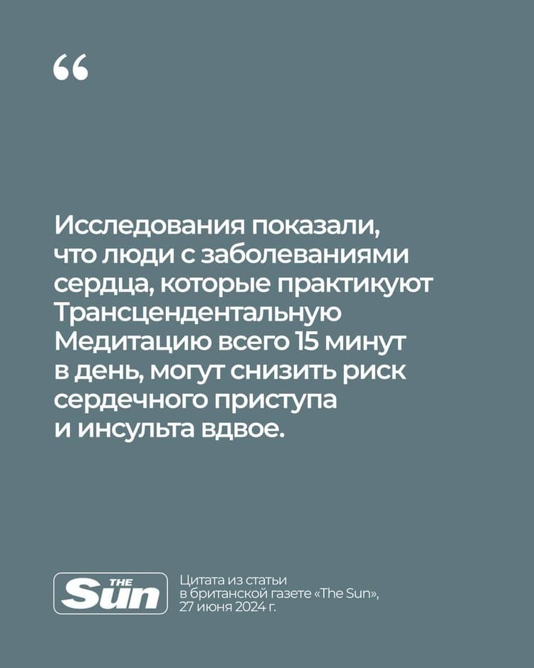 Британская газета-таблоид "The Sun" опубликовала статью о сердечно-сосудистых заболеваниях и методах их профилактики. Среди простых советов по изменению образа жизни для улучшения здоровья сердца оказались такие пункты как: быть общительным и заводить новые знакомства, добавлять в приёмы пищи источник Омега-3, сохранять здоровый вес, а также практиковать умственную технику Трансцендентальной Медитации."Исследования показали, что люди с заболеваниями сердца, которые практикуют Трансцендентальную Медитацию всего 15 минут в день, могут снизить риск сердечного приступа и инсульта вдвое" — цитата из статьи.