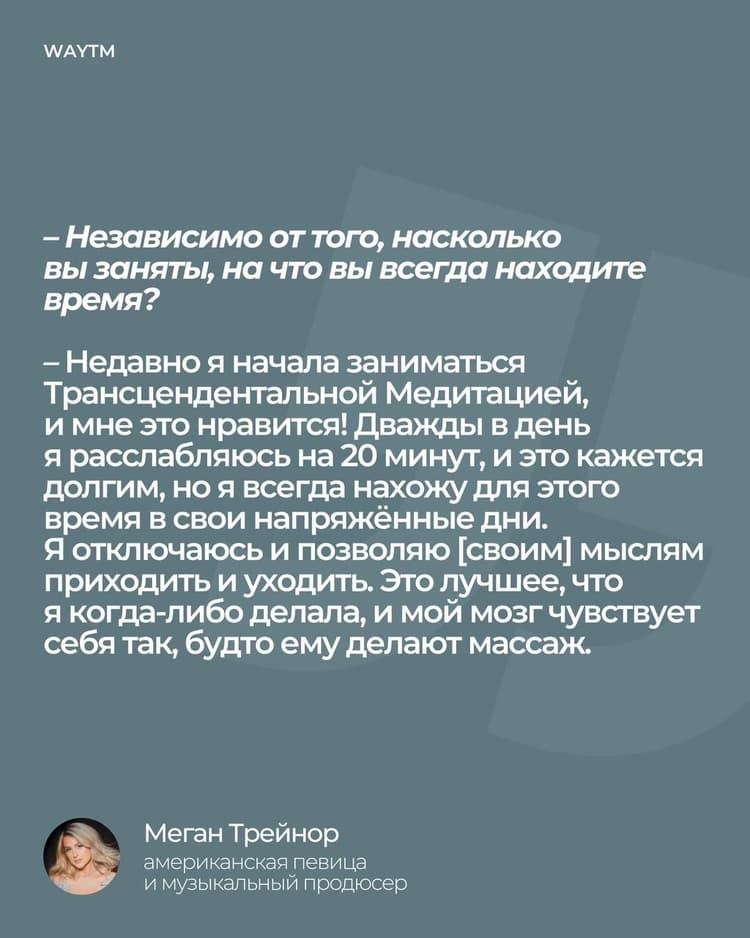 Меган Трейнор, американская певица и музыкальный продюсер, в одном из интервью поделилась как Трансцендентальная Медитация помогает ей в напряженные дни и в плотном графике.