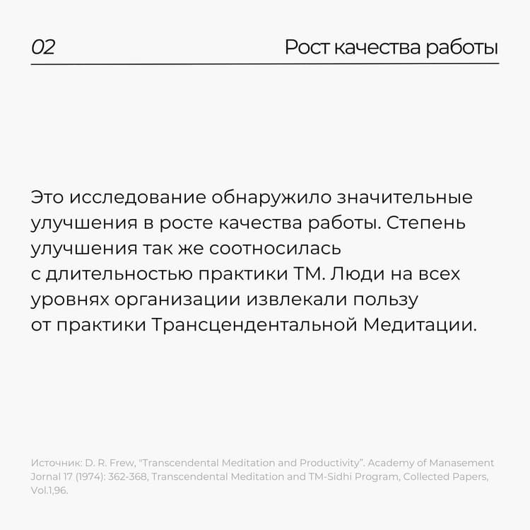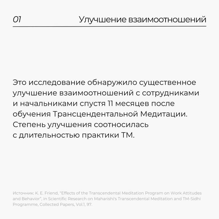 Научные исследования о влиянии практики Трансцендентальной Медитации на профессиональную деятельность показывают положительные результаты: 1️⃣в улучшении отношений в коллективе; 2️⃣в росте качества выполняемой работы; 3️⃣в степени удовлетворенности результатами труда.