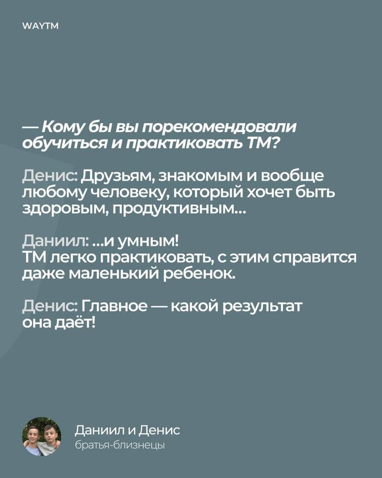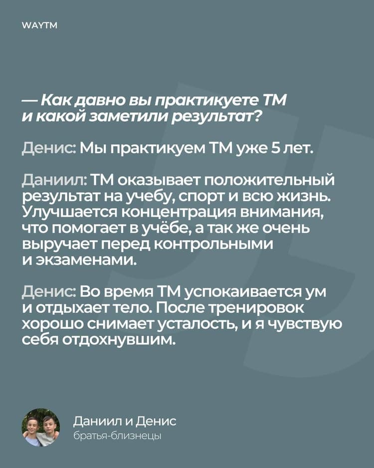 Братья-близнецы Даниил и Денис практикуют Трансцендентальную Медитацию уже 5 лет. Мальчики отмечают, что практика им помогает сосредоточиться перед контрольными, сбросить усталость после тренировок, найти новые интересные решения.