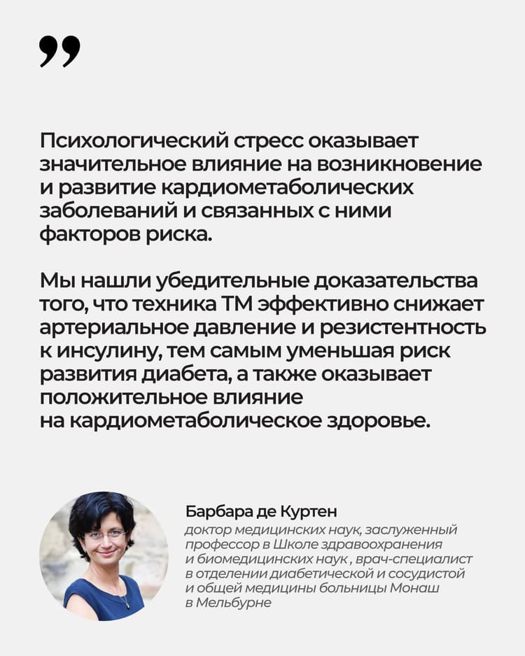«Психологический стресс оказывает значительное влияние на возникновение и развитие кардиометаболических заболеваний и связанных с ними факторов риска. Мы нашли убедительные доказательства того, что техника ТМ эффективно снижает артериальное давление и резистентность к инсулину, тем самым уменьшая риск развития диабета, а также оказывает положительное влияние на кардиометаболическое здоровье.