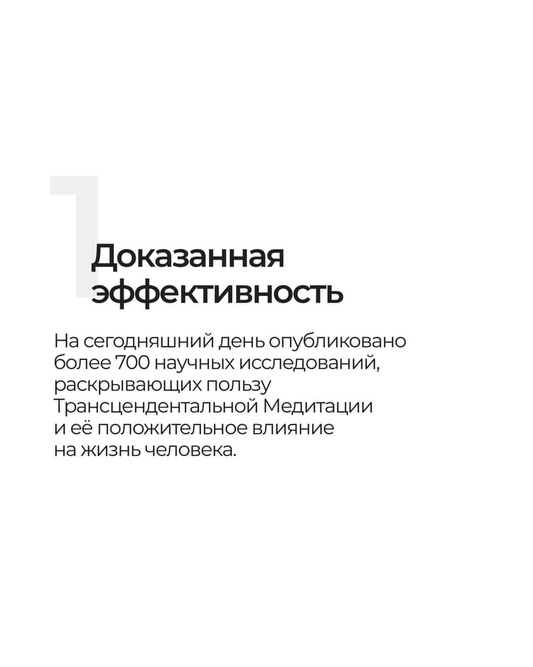 Практика Трансцендентальной Медитации делает наш ум ясным, упорядоченным и спокойным. И это создает прочную основу для нашей жизни. Ведь действия из такого состояния ума приносят более эффективный результат, решение сложных задач требует меньше усилий, а резервуар внутренней энергии при этом не истощается.