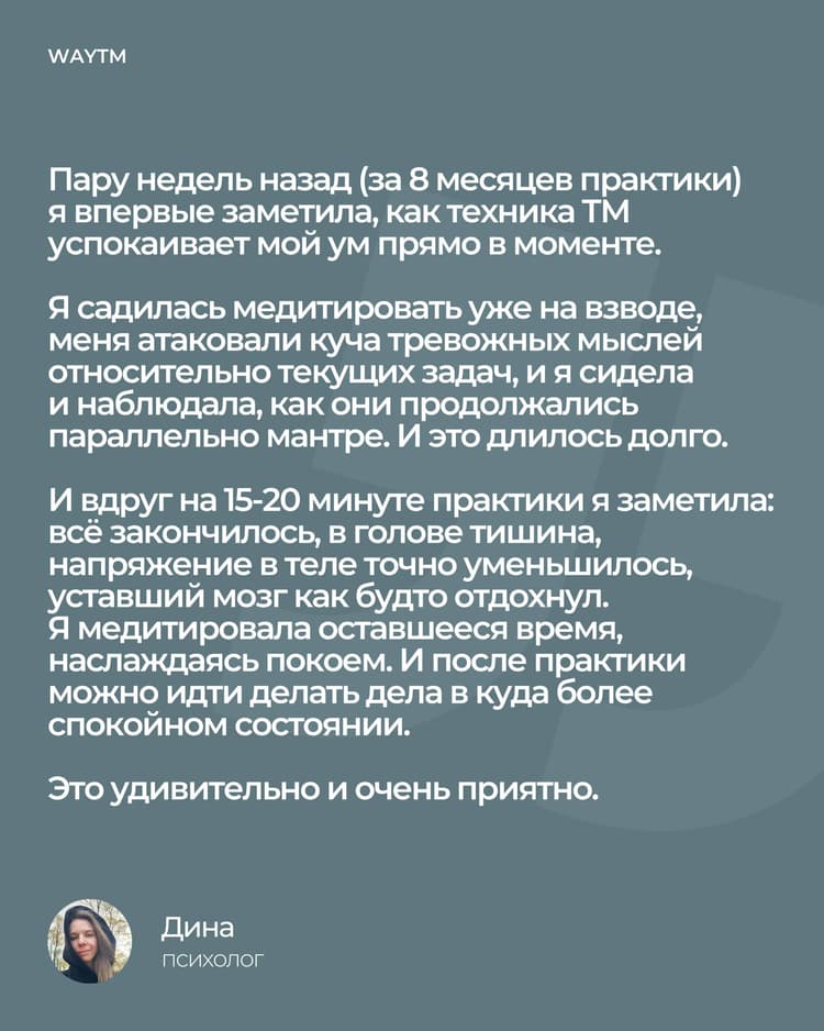 ⬆️ О том, как в период напряжения и тревоги практика ТМ помогла обрести покой "в моменте", поделилась с нами Дина, психолог из Воронежа.